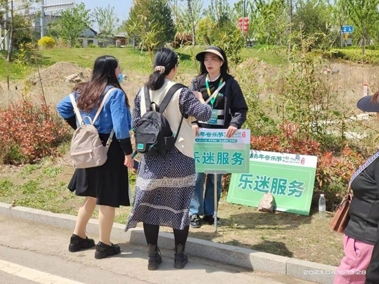 在音樂節(jié)會場外,一名手持“樂迷服務(wù)“導(dǎo)引牌的志愿者耐心為兩名樂迷指引入場方向。趙峰睿/攝