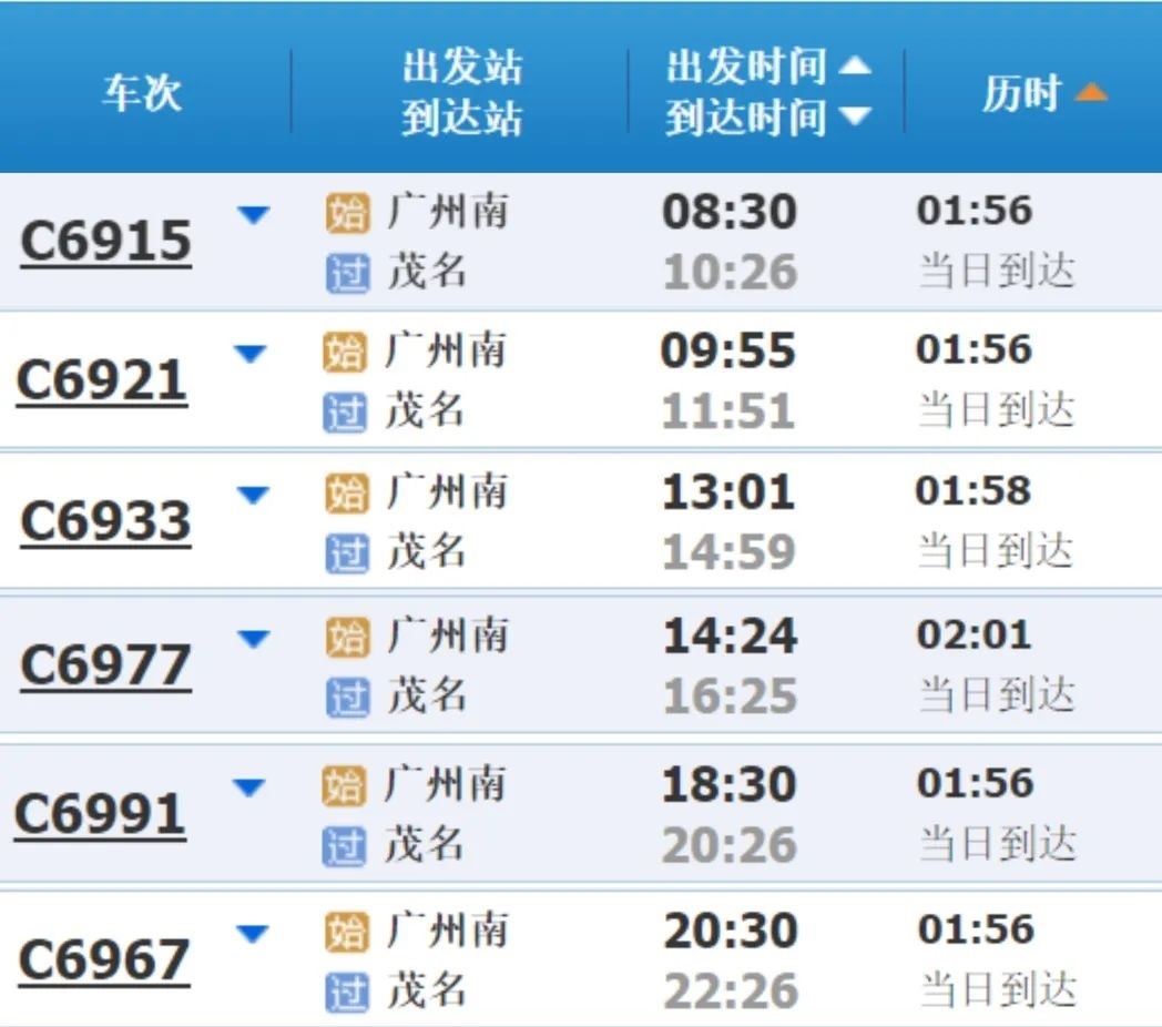 廣州南站至茂名直達(dá)車(chē):