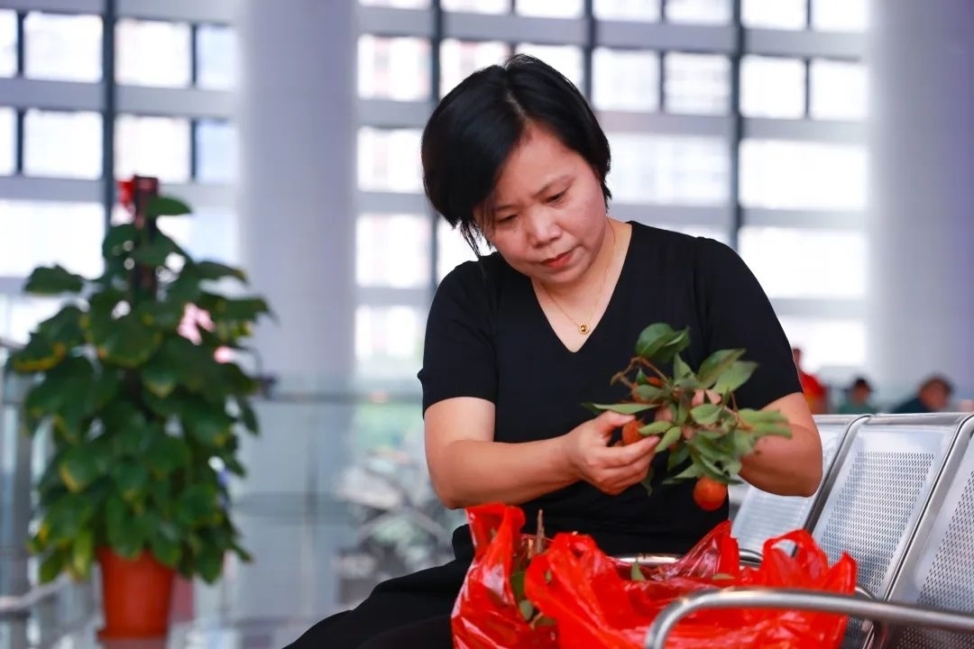寬敞明亮的候車(chē)室內(nèi),旅客蘭海英正利用候車(chē)時(shí)間打理剛買(mǎi)到的荔枝。她是從廣州到茂名出差,看到有新鮮荔枝上市,馬上買(mǎi)了12斤白糖罌。