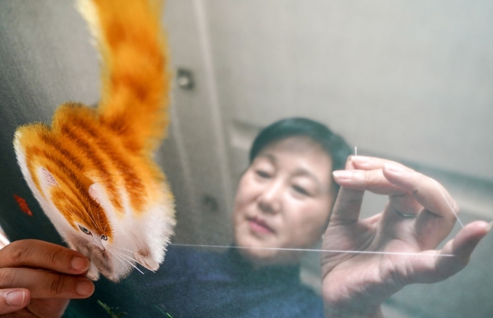 蘇繡國家級非遺傳承人姚惠芬在刺繡雙面繡(2019年6月11日攝)。新華社記者 楊磊 攝