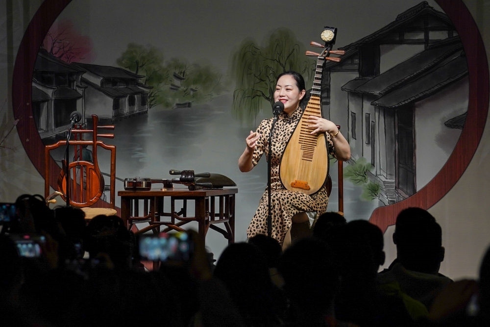 評彈演員吳亮瑩在蘇州市姑蘇區(qū)一處評彈茶館演唱蘇州評彈版《聲聲慢》(2023年4月5日攝)。新華社記者 李博 攝