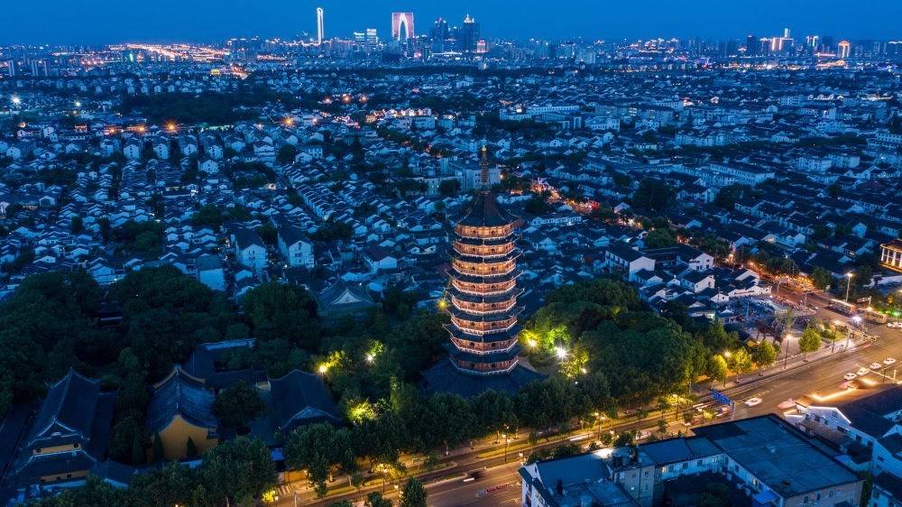 這是2020年8月24日在蘇州市姑蘇區(qū)拍攝的城區(qū)夜景(無人機照片)。新華社記者 李博 攝