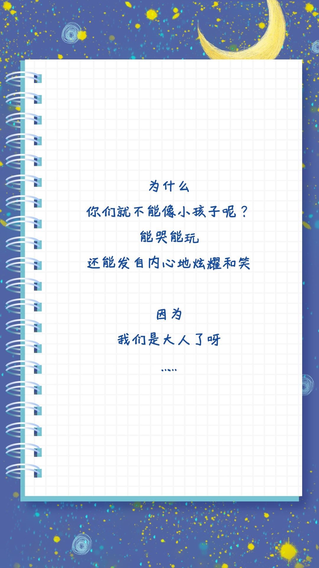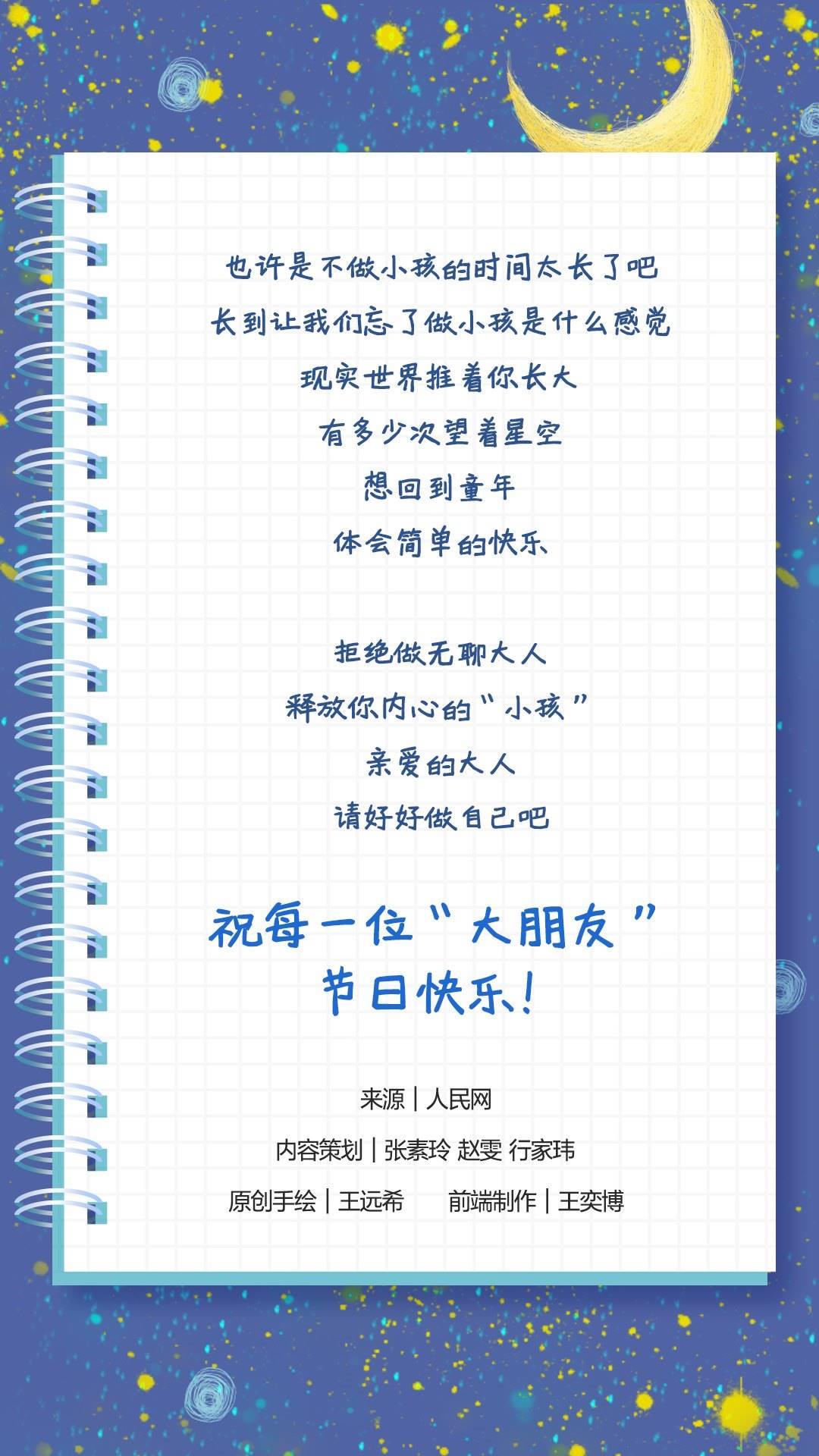 也許是不做小孩的時間太長了吧,長到讓我們忘了做小孩是什么感覺。現(xiàn)實世界推著你長大,有多少次仰望星空,想回到童年,體會簡單的快樂。拒絕做無聊大人,釋放內(nèi)心的“小孩”,親愛的大人,請好好做自己吧!祝每一位“大朋友”節(jié)日快樂!