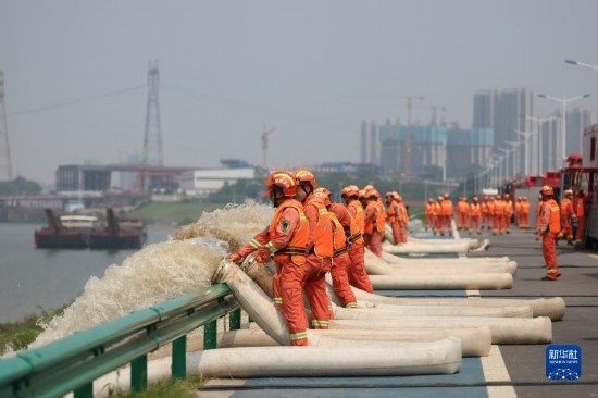 6月2日,在水域救援實(shí)戰(zhàn)演習(xí)現(xiàn)場,消防救援人員在湘江邊模擬內(nèi)澇排水。