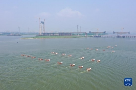這是6月2日在水域救援實(shí)戰(zhàn)演習(xí)現(xiàn)場拍攝的消防舟艇編隊(無人機(jī)照片)。