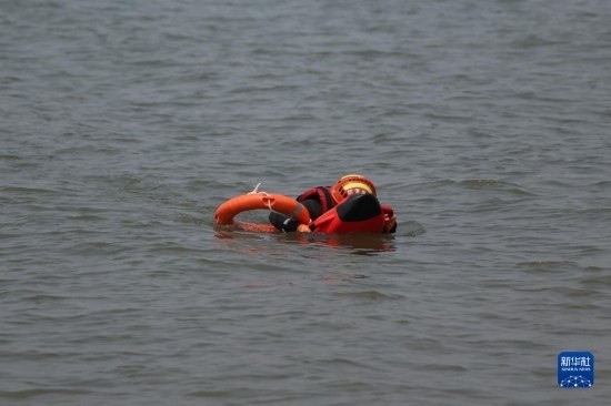 6月2日,在水域救援實(shí)戰(zhàn)演習(xí)現(xiàn)場,一名模擬被困人員依靠智能水上救生遙控機(jī)器人回到岸邊。