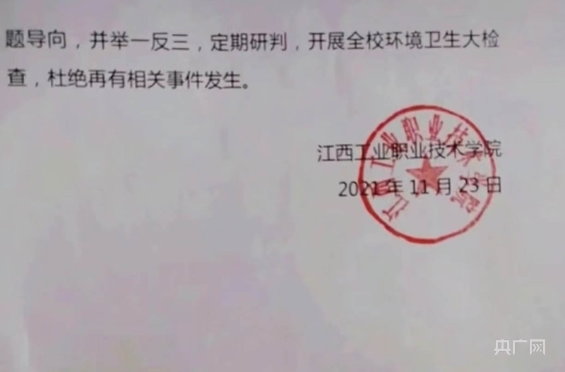 情況通報(bào)還提到,南昌市高新區(qū)市場監(jiān)督管理局接到情況報(bào)告后,第一時(shí)間派出執(zhí)法人員到江西工業(yè)職業(yè)技術(shù)學(xué)院開展調(diào)查,問詢學(xué)校工作人員、食堂負(fù)責(zé)人、當(dāng)事學(xué)生及相關(guān)知情人,對食品留樣進(jìn)行采樣檢測。
