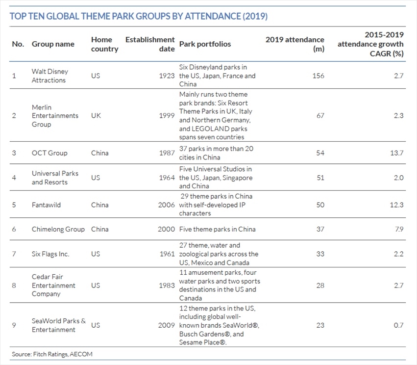 惠譽(yù)評(píng)級(jí)發(fā)布的主題公園藍(lán)皮書(shū)也顯示,從2019年全球各大主題公園集團(tuán)旗下樂(lè)園的游客量來(lái)看,歡樂(lè)谷的母公司華僑城集團(tuán)位列第3,旗下主題公園2019年的游客量約5400萬(wàn)人次;華強(qiáng)方特位列第5,旗下主題公園2019年的游客量約5000萬(wàn)人次;長(zhǎng)隆集團(tuán)位列第6,旗下主題公園2019年的游客量約3700萬(wàn)人次。