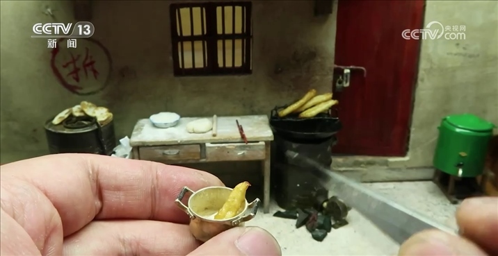 趙培藝:有一位網(wǎng)友外婆腿腳不好,沒有辦法回老家。然后他跟我說,能不能給他復(fù)原一個小的,給她放在床頭上讓她看著,大概拍了二十幾張照片,然后測量數(shù)值是測了大概三四次,他原本是什么材質(zhì),我就盡量去用什么材質(zhì),例如小的瓷磚,我都是去廠里訂的小陶瓷片,像地板之類的,我都是用手工燒的小紅磚去做。想家里了,一歪頭就能看到。