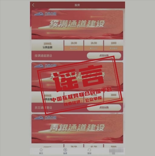 真相:近期,中國國家鐵路集團(tuán)有限公司接到群眾來電咨詢,反映一款名為“八縱八橫”APP程序自稱是國鐵集團(tuán)授權(quán)推出的理財(cái)產(chǎn)品,設(shè)有“呼南通道建設(shè)”“沿海通道建設(shè)”“京蘭通道建設(shè)”等9款投資理財(cái)項(xiàng)目,并將國鐵集團(tuán)公司簡介、新聞報道等內(nèi)容在APP中用于宣傳推廣。對此,國鐵集團(tuán)發(fā)布嚴(yán)正聲明稱,國鐵集團(tuán)及所屬單位從未授權(quán)或利用其他網(wǎng)站、APP、微信公眾號、微博等形式以“國鐵集團(tuán)”或“中國鐵路”的名義銷售投資理財(cái)產(chǎn)品,也沒有通過這樣的方式籌集鐵路建設(shè)資金。不法分子利用“八縱八橫”APP程序所實(shí)施的行為和發(fā)布的內(nèi)容已涉嫌詐騙,請公眾提高警惕,謹(jǐn)慎區(qū)分,注意防騙。如已被騙,請立即向公安機(jī)關(guān)報案。(來源:“中國鐵路”微信公眾號)