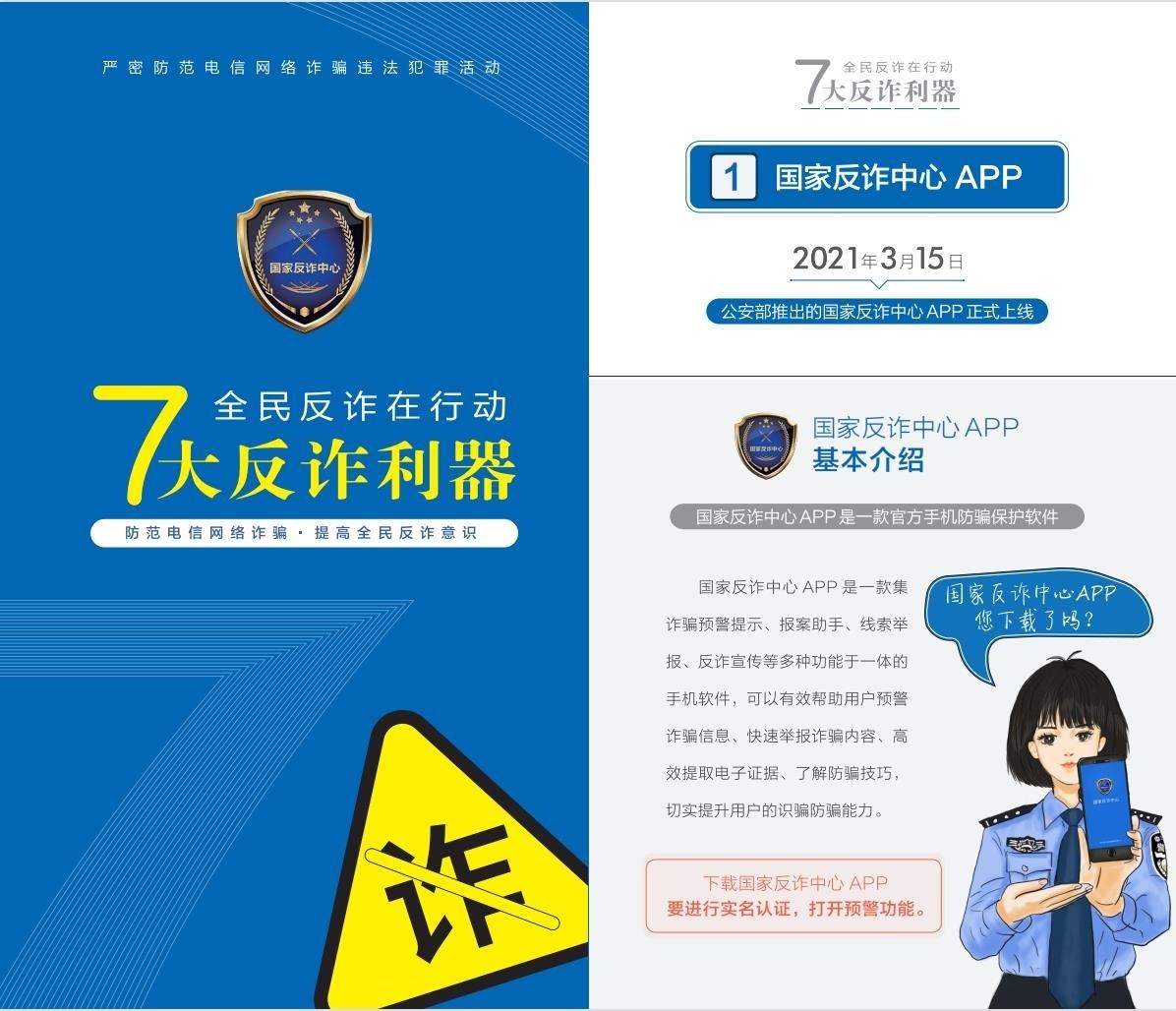 聚焦“關(guān)口前移、預(yù)防為先”,《手冊(cè)》詳細(xì)介紹了過(guò)去兩年里,公安部會(huì)同工信部、中國(guó)人民銀行聯(lián)合推出的七大反詐利器——國(guó)家反詐中心APP、96110預(yù)警勸阻專(zhuān)線(xiàn)、12381涉詐預(yù)警勸阻短信系統(tǒng)、全國(guó)移動(dòng)電話(huà)卡“一證通查”、云閃付APP“一鍵查卡”、反詐名片、全國(guó)互聯(lián)網(wǎng)賬號(hào)“一證通查2.0”的主要功能和下載查詢(xún)方法,鼓勵(lì)廣大群眾多下載多使用,共同構(gòu)筑攔截電信網(wǎng)絡(luò)詐騙的“防火墻”。