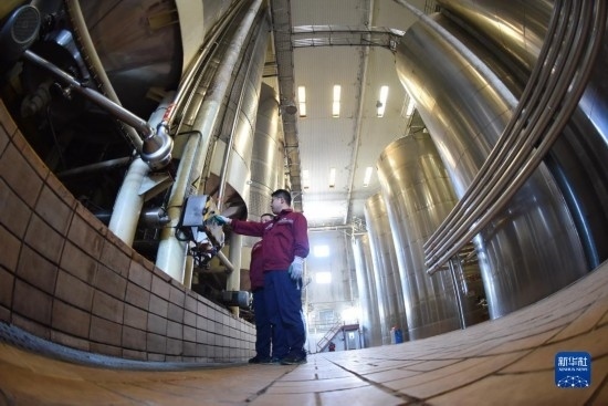 6月21日,在河北省懷來縣長城葡萄酒廠,一名工人在葡萄酒生產(chǎn)線上監(jiān)控生產(chǎn)情況。