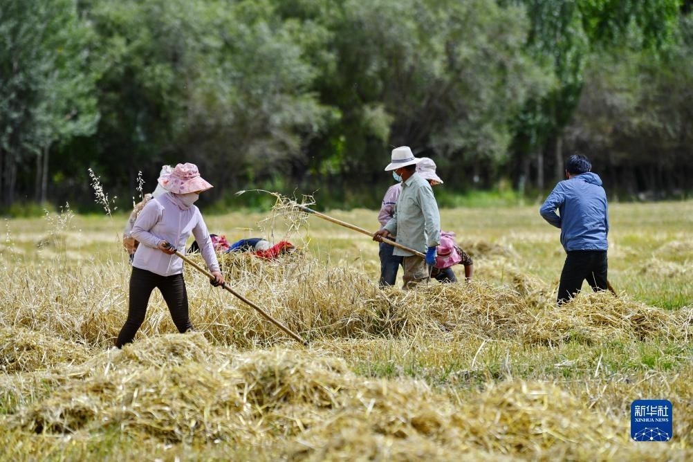 近日,西藏拉薩市曲水縣青稞成熟,人們忙著收割青稞,感受豐收的喜悅。
