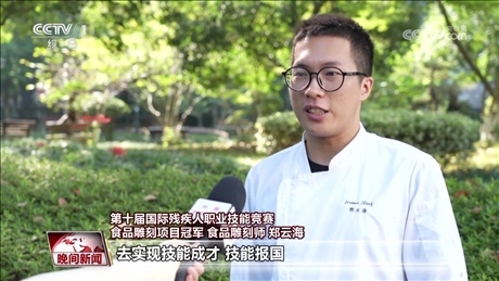 第十屆國(guó)際殘疾人職業(yè)技能競(jìng)賽食品雕刻項(xiàng)目冠軍 食品雕刻師 鄭云海:最近有火炬(傳遞),寓意就是美好、和平,還有吉祥。我想用自己的技能去宣傳我們杭州亞運(yùn)會(huì)的一個(gè)文化。