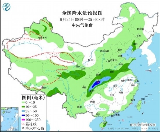 9月24日08時(shí)至25日08時(shí),青海南部、甘肅南部、陜西南部、四川東部、重慶、湖北西部和北部、河南、山東南部等地部分地區(qū)有中到大雨,其中,四川東北部、重慶北部等地局地有暴雨或大暴雨(100~120毫米)。