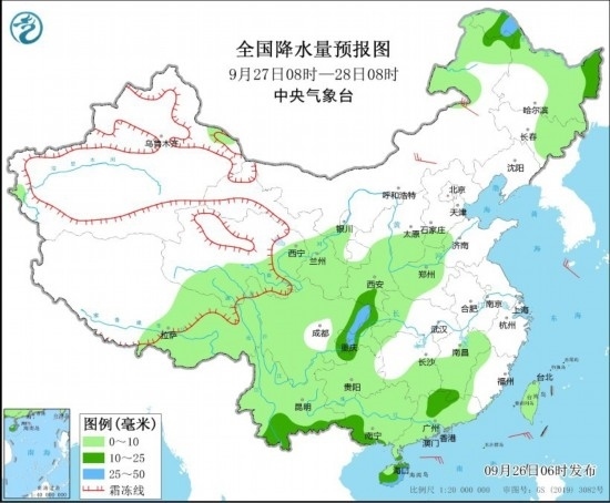 9月26日08時(shí)至27日08時(shí),內(nèi)蒙古東北部、黑龍江西北部、新疆北疆北部和北疆東部、青海東部、甘肅中部、陜西南部、華南南部和海南島等地部分地區(qū)有中到大雨,其中,廣西西南部和東南部沿海、廣東西南部沿海、海南島東部和西南部等地部分地區(qū)有暴雨或大暴雨(100~150毫米)。
