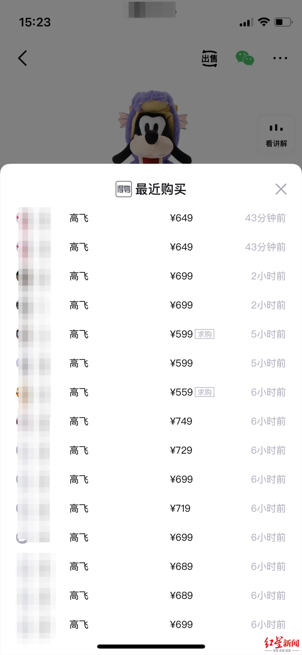 這名網(wǎng)友最終在迪士尼地鐵站附近從他人手中購買了“紫龍高飛”系列商品。據(jù)其描述,兜售者是名男子,隨身攜帶大量“紫龍高飛”鑰匙圈、毛絨玩具,現(xiàn)場不少人詢問價格?!拔覇柲懿荒苤毁I一樣,他說是一套賣的,愛買不買?!痹摼W(wǎng)友向紅星新聞出示了付款記錄稱,當天下午兩點多,其支付了850元,購買了“紫龍高飛”鑰匙圈和毛絨玩具,兩件商品原價合計318元。