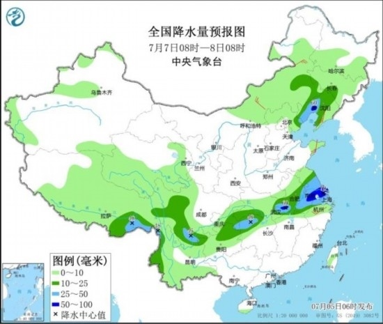 全國降水量預(yù)報圖(7月6日08時-7日08時)。圖片來源:中央氣象臺網(wǎng)站