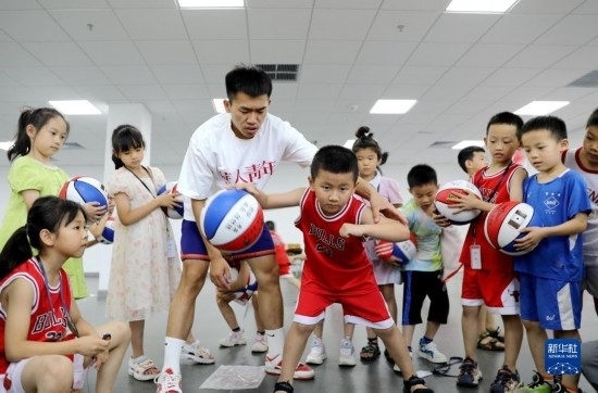 7月11日,在河南省濟(jì)源市,孩子們?cè)诶蠋煹闹笇?dǎo)下練習(xí)籃球。