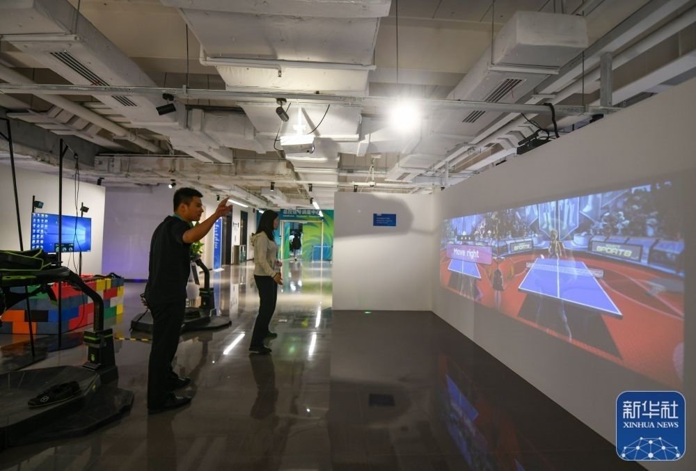 ↑?7月13日,在成都大運(yùn)會(huì)主媒體中心的休閑娛樂區(qū),兩名媒體記者在體驗(yàn)互動(dòng)投影乒乓球。新華社記者 王曦 攝
