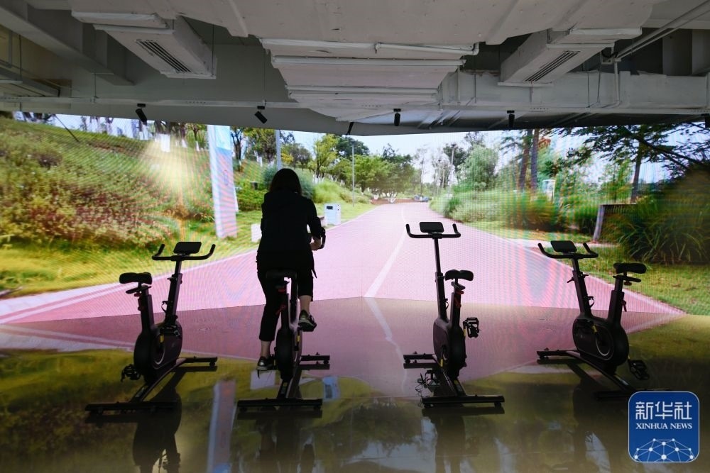 ↑7月14日,媒體工作人員在成都大運(yùn)會(huì)主媒體中心休閑娛樂區(qū)內(nèi)體驗(yàn)騎行。新華社記者 胥冰潔 攝
