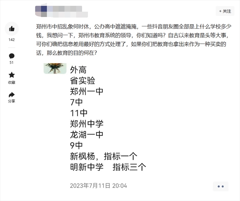 7月16日,有群眾通過頂端新聞“我想@領導”平臺向鄭州市教育局局長留言:“掏錢就能上?鄭州中招販賣名額成風”“公開賣高中名額,鄭州教育局都不管嗎”等類似留言。