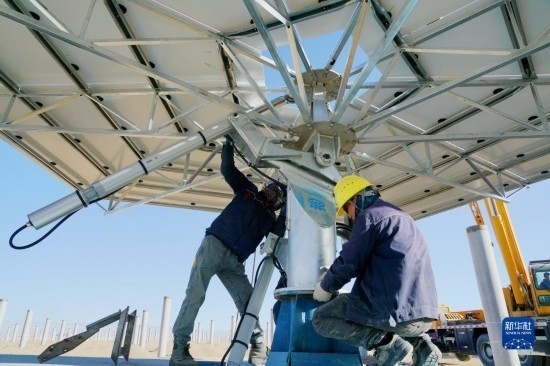 7月21日,在阿克塞千萬千瓦級(jí)可再生能源多能互補(bǔ)基地,工人在匯東新能源75萬千瓦光熱+項(xiàng)目建設(shè)現(xiàn)場安裝定日鏡。新華社發(fā)(馬曉偉 攝)