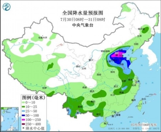 7月30日08時至31日08時,華北中東部、黃淮東部、江淮中東部、江南北部、西南地區(qū)東部和南部等地的部分地區(qū)有中到大雨,其中,北京南部、天津、河北大部、山東中西部等地部分地區(qū)有暴雨或大暴雨,河北中部等地局地特大暴雨(250~280毫米)。新疆東部、河北南部、浙江北部等地部分地區(qū)有4~6級風。