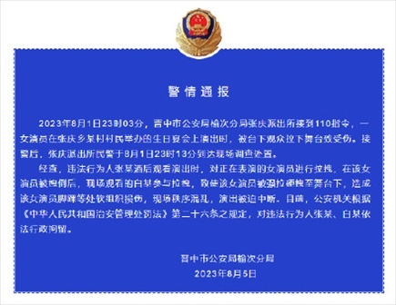 ·山西晉中警方通報女演員被觀眾拉下舞臺致傷:兩人被行拘。