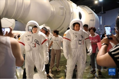 小朋友們在位于沈陽市的遼寧省科技館里航天展區(qū)參觀留影。