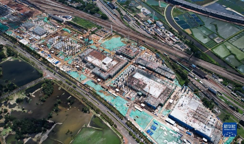 ??谛潞8酆湍细邸岸€口岸”(貨運(yùn))集中查驗(yàn)場(chǎng)所建設(shè)項(xiàng)目(7月21日攝,無(wú)人機(jī)照片)。