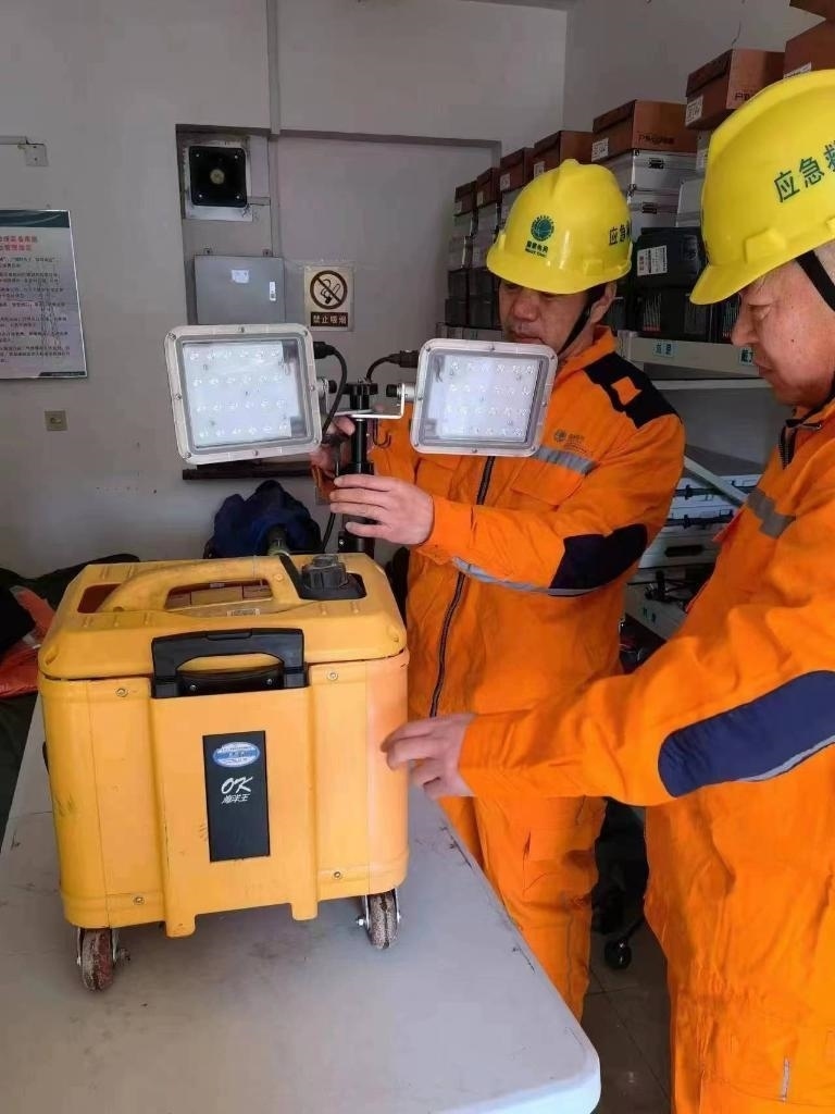 在鳳城市藍旗鎮(zhèn)廣勝村小學臨時安置點,藍旗鎮(zhèn)供電所工作人員正在調(diào)試應急照明設備。(國網(wǎng)丹東供電公司供圖)