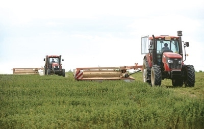 鹽池縣農戶在牧草基地開展收割作業(yè)。 新華社記者 楊植森攝