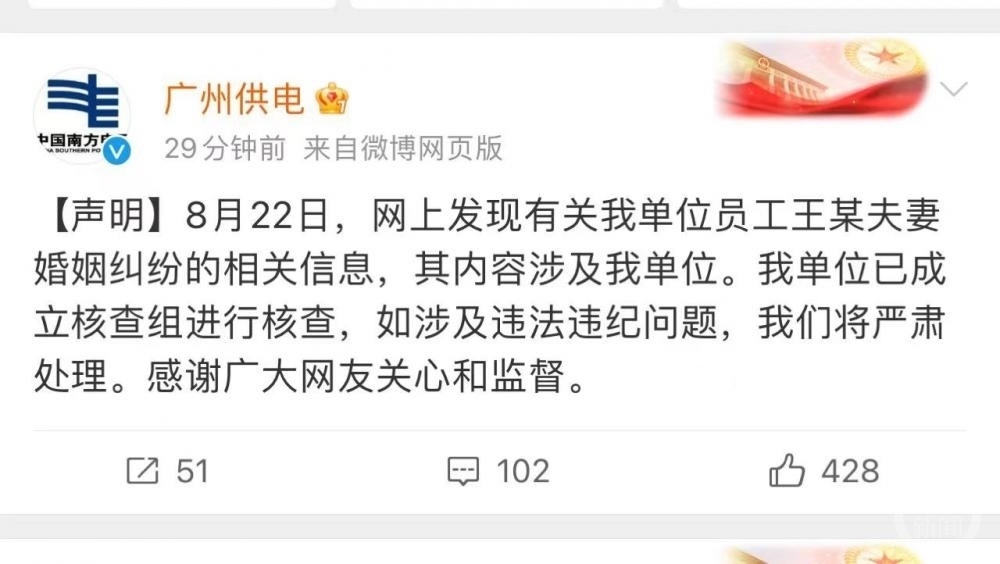 8月22日晚間,廣州供電局官方社交賬號發(fā)布聲明稱:“8月22日,網(wǎng)上發(fā)現(xiàn)有關(guān)我單位員工王某夫妻婚姻糾紛的相關(guān)信息,其內(nèi)容涉及我單位。我單位已成立核查組進行核查,如涉及違法違紀問題,我們將嚴肅處理。感謝廣大網(wǎng)友關(guān)心和監(jiān)督?!?/p>