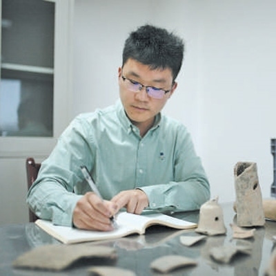 許丹陽(yáng)在整理記錄出土陶器。受訪者供圖