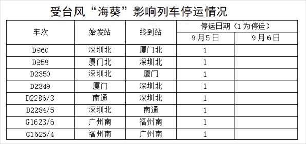 據(jù)中央氣象臺消息,今年第11號臺風“??庇诮裉欤?月5日)早晨5點20分前后在福建省東山縣沿海登陸,福建東部部分地區(qū)將有大暴雨,并伴有短時強降水,局地有雷暴大風等強對流天氣。為防范臺風影響,保障鐵路運輸安全,中國鐵路南昌局集團有限公司繼續(xù)調(diào)整部分旅客列車運行方案,停運管內(nèi)途經(jīng)杭深線福州南至詔安,龍漳線龍巖至漳州,昌福線三明北至福州等區(qū)段旅客列車。同時,加開15趟旅客列車,方便旅客出行。