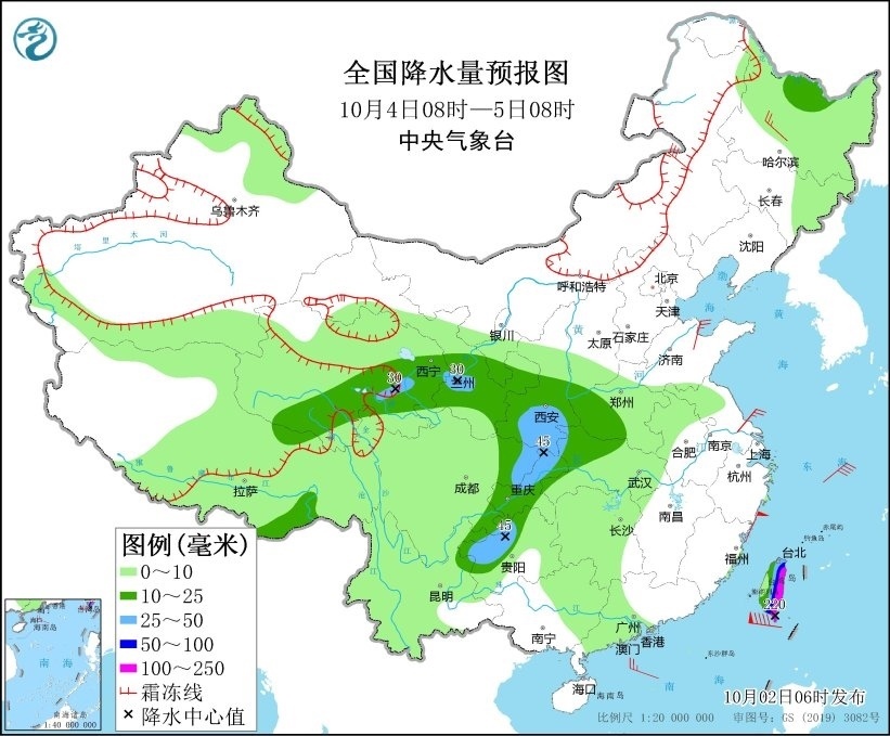 10月4日08時(shí)至5日08時(shí),西藏東南部、青海中東部、甘肅中南部等地部分地區(qū)有中到大雪或雨夾雪,局地有暴雪。黑龍江北部、陜西中南部、四川東部、重慶、貴州西部、湖北西北部、河南西部以及臺(tái)灣島大部等地部分地區(qū)有中到大雨,其中,臺(tái)灣島東部和南部等地部分地區(qū)有暴雨或大暴雨(100~220毫米)。內(nèi)蒙古中部、黑龍江西南部、山東中部等地部分地區(qū)有4~6級(jí)風(fēng)。渤海、渤海海峽、黃海大部、東海北部將有6~7級(jí)風(fēng)、陣風(fēng)8級(jí),東海西南部海域風(fēng)力將有7~8級(jí)風(fēng)、陣風(fēng)9級(jí)。臺(tái)灣以東洋面將有12~14級(jí)風(fēng)、陣風(fēng)15級(jí),臺(tái)灣海峽將有10~12級(jí)風(fēng)、陣風(fēng)13級(jí),巴士海峽將有11~12級(jí)風(fēng)、陣風(fēng)13級(jí)(見(jiàn)圖3)。