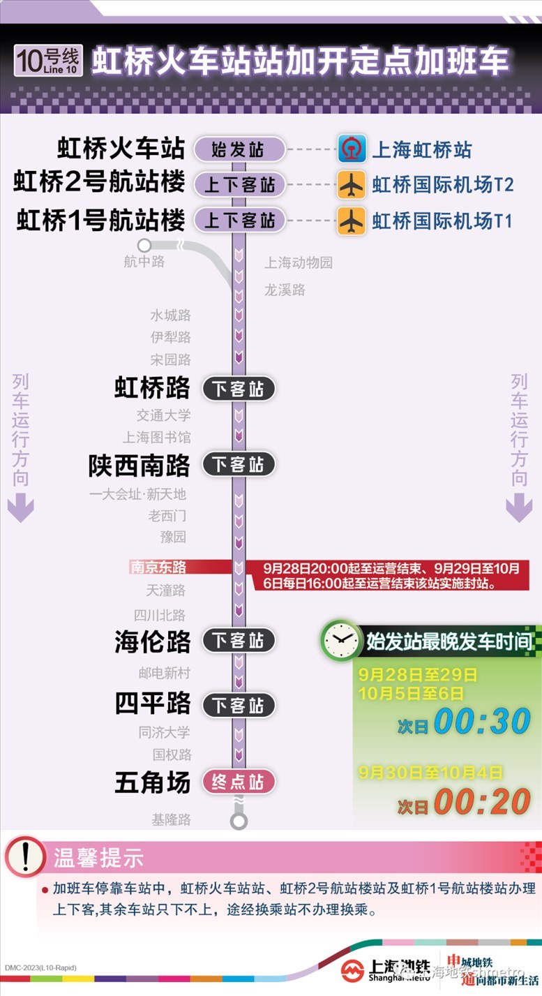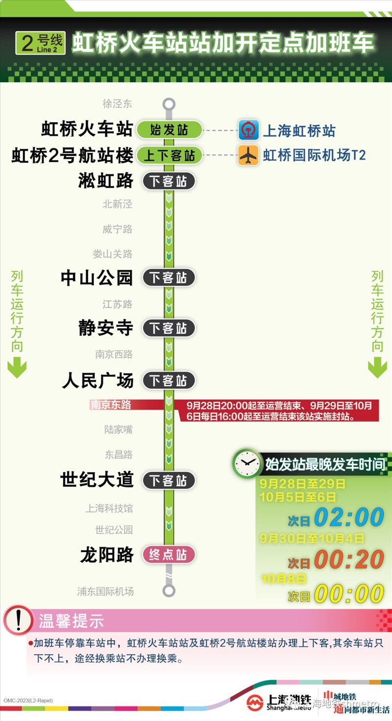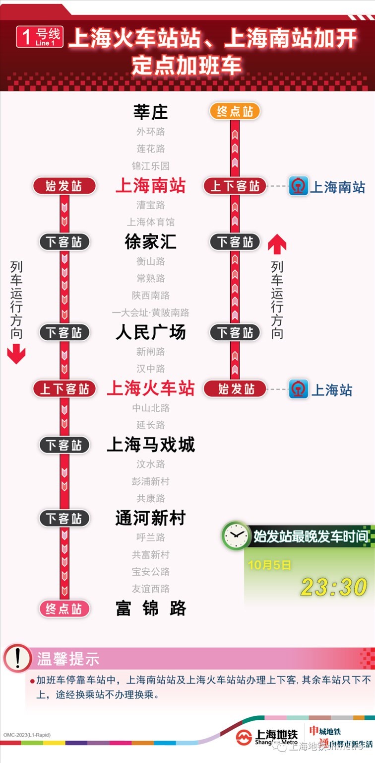 此外為做好節(jié)假日返程期間上?;疖囌?、虹橋火車站、上海南站的夜間客流疏散工作,10月5日,地鐵1號線在圖定基礎(chǔ)上實施定點加開方案,加開末班車發(fā)車時間至23:30;另10月8日地鐵2號線增加定點加班車班次,加開末班車發(fā)車時間至次日0:00。