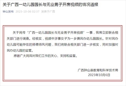 ·廣西鐘山縣通報(bào)幼兒園園長(zhǎng)與男子開(kāi)房視頻:系某民辦幼兒園園長(zhǎng),將進(jìn)一步核實(shí)師德師風(fēng)問(wèn)題。