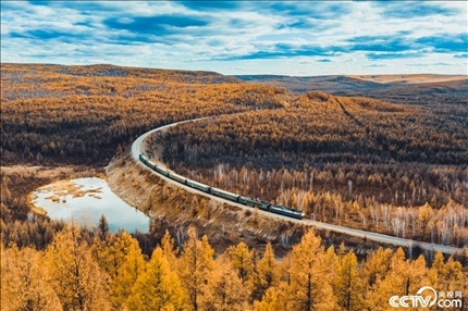 內(nèi)蒙古呼倫貝爾,牙林鐵路上的列車(chē)穿行在大興安嶺的金色樹(shù)林之中,美如畫(huà)卷。