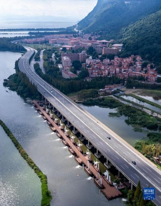 這是10月6日拍攝的位于高速公路橋下的滇池綠道草海段鋼浮橋(無人機照片)。