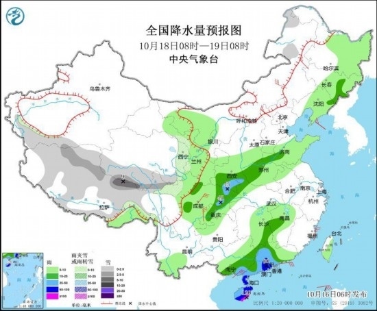10月18日08時至19日08時,西藏北部和東部、青海南部和東部、川西高原北部等地的部分地區(qū)有小到中雪或雨夾雪,其中西藏東北部等地局地大雪;吉林東部、陜西南部、河南北部和西部、四川北部和東部、重慶、湖南東南部、江西中南部、廣東中西部、廣西東南部、海南島等地有中到大雨,其中,廣東西南部和中部、海南島等地的部分地區(qū)有暴雨,局地大暴雨(100~120毫米)。內蒙古中東部、西北地區(qū)東部、河北北部、遼東半島、四川盆地中西部、廣西東南部等地的部分地區(qū)有4~6級風。