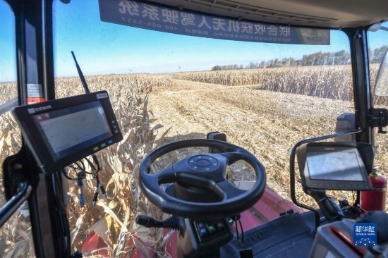10月19日,在中國科學(xué)院“黑土糧倉”科技會戰(zhàn)長春示范區(qū)公主嶺示范基地,無人駕駛農(nóng)機(jī)在收獲玉米。