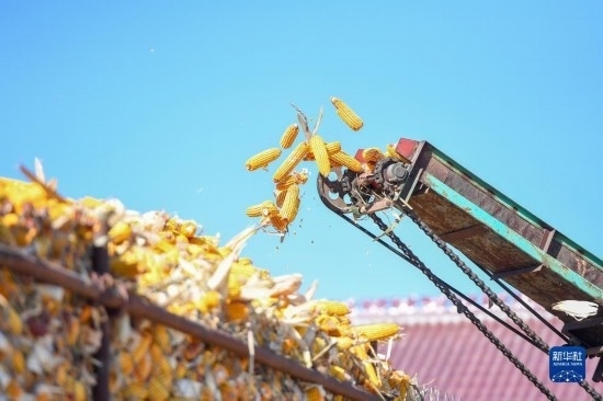 10月19日,在吉林省公主嶺市友忠種植農(nóng)民專業(yè)合作社,農(nóng)民將收獲的玉米放入科學(xué)儲糧倉。