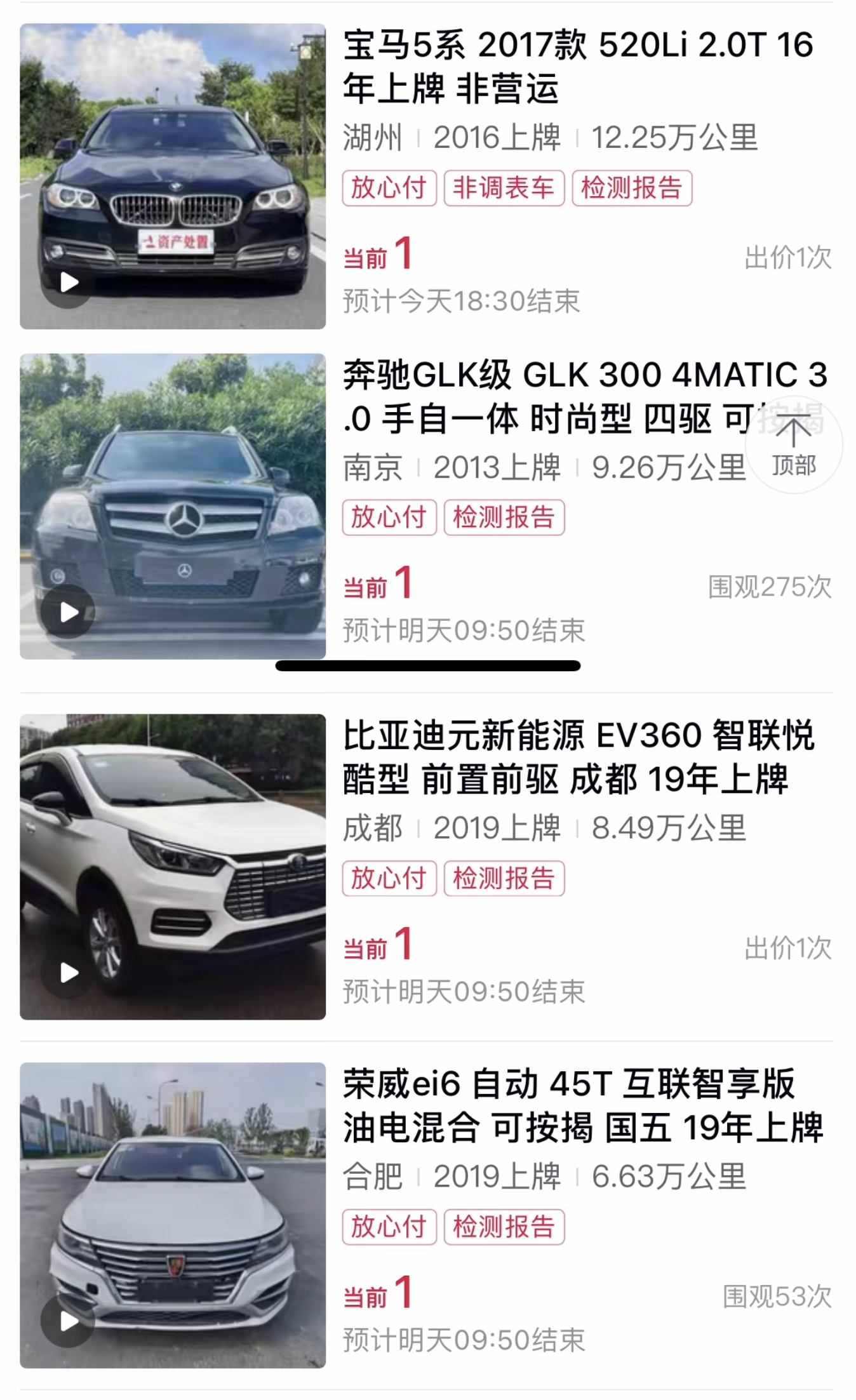 “1元賣奔馳”現(xiàn)象在該拍賣公司并只此一例。紅星新聞?dòng)浾咴谏鲜鑫錆h鑫車公司的平臺拍賣界面上看到,低價(jià)拍賣的車輛并不少見。如該公司掛出的一輛2011年上牌的寶馬2系,起拍價(jià)僅8元;一輛2015年上牌的奔馳GLA起拍價(jià)僅需9元。