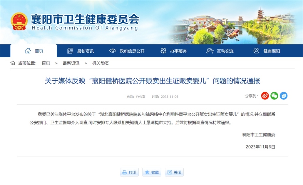 ·醫(yī)院院長被舉報涉嫌販賣出生證,襄陽衛(wèi)健委通報:聯(lián)系公安部門、衛(wèi)生監(jiān)督局介入調(diào)查,同時安排專人聯(lián)系相關(guān)知情人士懇請?zhí)峁┲С?。后續(xù)將根據(jù)調(diào)查情況持續(xù)通報。