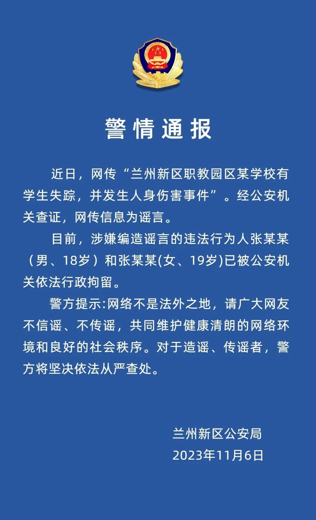 ·蘭州新區(qū)警方:“某學校學生失蹤”為謠言,兩名造謠者被行拘。
