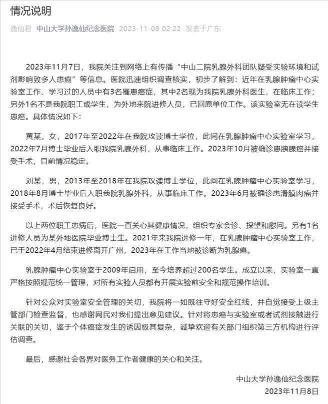 ·中山二院通報(bào)乳腺外科團(tuán)隊(duì)多人患癌:近年有3人患癌,無(wú)在讀學(xué)生。