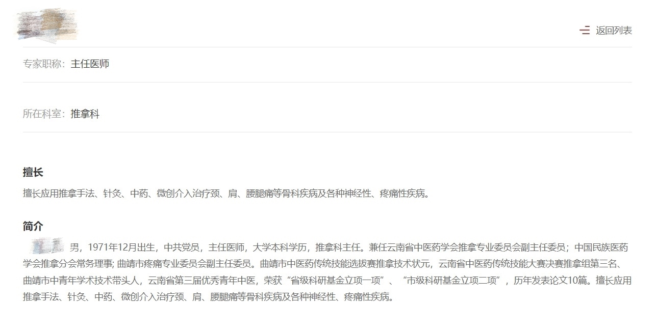 而在曲靖中醫(yī)醫(yī)院官網(wǎng)上,張樹昆醫(yī)生的簡(jiǎn)介為:推拿科主任醫(yī)師,擅長(zhǎng)應(yīng)用推拿手法、針灸、中藥、微創(chuàng)介入治療肩、頸、腰腿等骨科疾病及各種神經(jīng)性、疼痛性疾病。