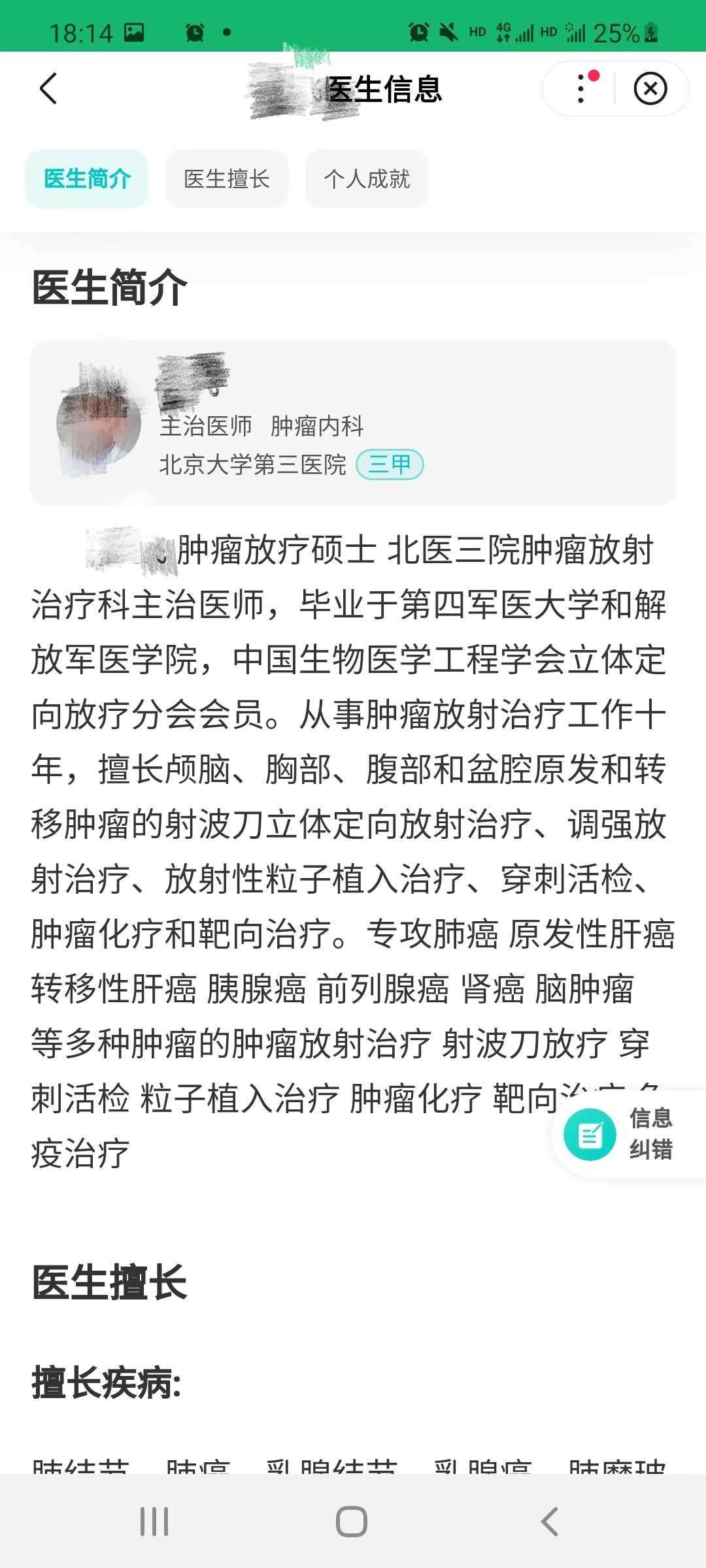 吳先生發(fā)給記者的百度健康頁面上顯示:這位醫(yī)生是腫瘤內(nèi)科的主治醫(yī)師,但其個(gè)人介紹里又寫著他是腫瘤放療科主治醫(yī)師,放療科醫(yī)生的執(zhí)業(yè)證書和內(nèi)科不同,吳先生也對(duì)平臺(tái)提出過質(zhì)疑,醫(yī)生到底是哪個(gè)科的?是否專業(yè)?